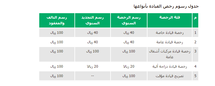 حددت الإدارة العامة للمرور في السعودية قائمة برسوم الإجراءات المرورية الخاصة برخص القيادة بكافة الأنواع؛ وهي ما بدأت من 20 ريال سعودي ووصلت إلى 100 ريال، وفيما يلي نستعرضها بالتفصيل: