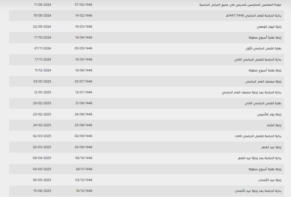 في هذا السياق تجدر الإشارة إلى أن وزارة التعليم قد أعلنت أيضًا بدورها عن التقويم الدراسي للتعليم العام 2024/2025 – 1446/1447، وهو ما جاء كالتالي: