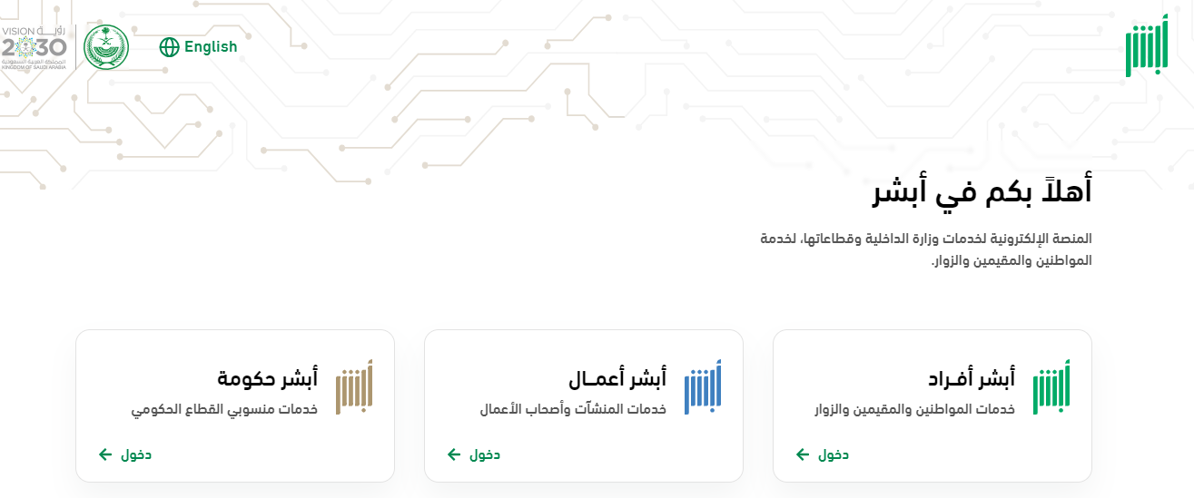 في البداية يتم الذهاب إلى منصة أبشر الإلكترونية.