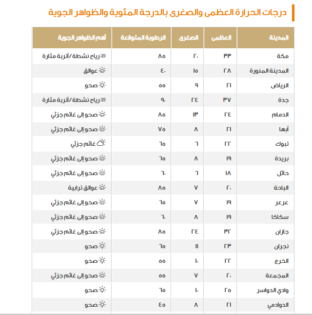 أما الضباب فقد ورد في بيان الأرصاد السعودية اليوم الذي يتكون على المنطقة الشرقية وجازان ومكة المكرمة، وأما درجات الحرارة فتأتي على النحو الآتي: