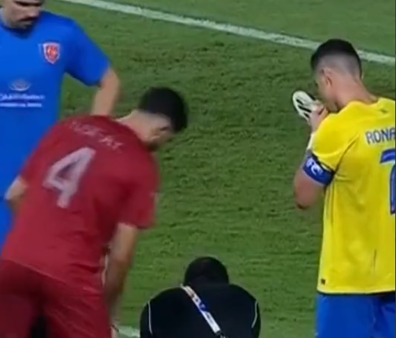 حيث ظهر البرتغالي "كريستيانو رونالدو" وهو يضع حذاء زميله "العمري" في فمه، وذلك حتى يفك رباط الحذاء الخاص لزميله بأسنانه.
